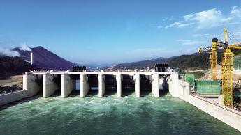目前,枢纽工程左岸8孔溢流闸已全部完工并投入运行。左岸两架塔吊持续作业,机电厂房建设正“拔节生长”。
